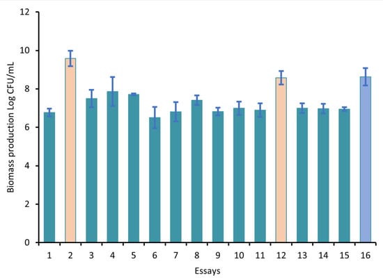 The maximum growth rate was obtained in the trial of Assay E2, where the exponential growth phase was reached, with 9.58 log CFU/mL at 48 h, 10% higher than the control pathway. Assay E12 had the next highest growth of the 16 trials performed. According to these results, adding yeast extract and the selected mineral salts supported a successful fermentation process.