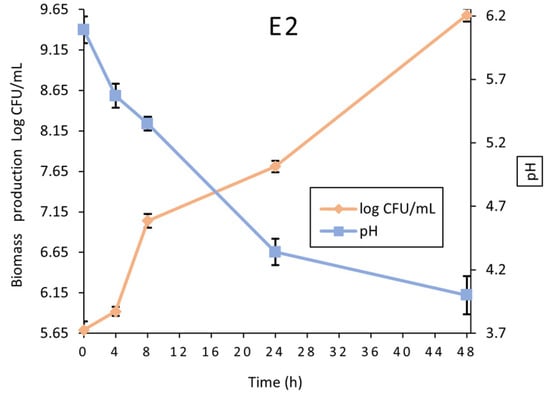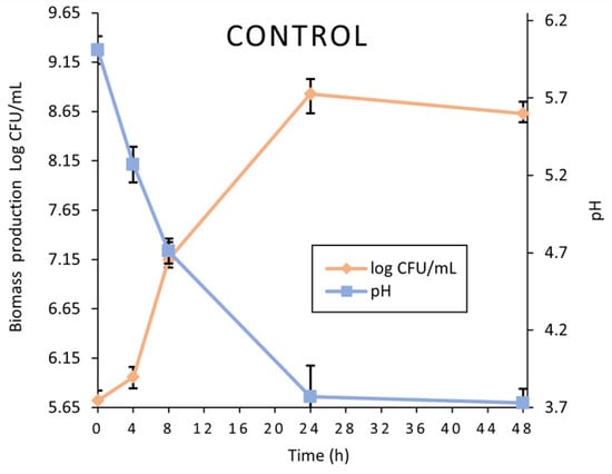 Cell growth was assessed using the standard plate count method. After 48 h, samples were collected from the Erlenmeyer flasks and grown on an agar plate with MRS medium (Merck, Madrid, Spain) after decimal dilutions in sterile water until 10−5, 10−6, and 10−7. Plates were incubated at 30 °C for 48 h. The pH was also measured as an indicator of the different stages in the growth cycle of the microorganism.