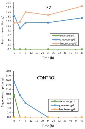 The utilization of sugars by LPPF19 during fermentation is presented in Figure 6, corresponding to E2 and control trials.