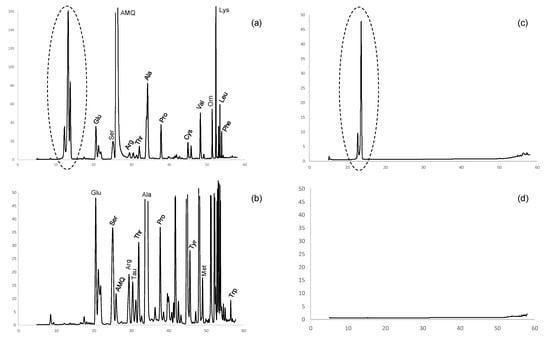 HPLC-UV-FL chromatograms obtained in the analysis of a treated patient at time 1 (2 h after rt-PA): (a) Derivatized plasma sample with UV detection at 254 nm, (b) derivatized plasma sample with fluorescence detection, (c) non-derivatized plasma sample with UV detection, and (d) non-derivatized plasma sample with fluorescence detection. The dashed circle marks the new compounds detected. Individual standard solutions of each amino acid were used for the determination of the retention times of these compounds with UV and FL detection. The assignation was confirmed with the ESI-MS results obtained applying the HPLC-MS method for derivatized samples.