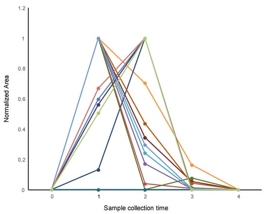 Time evolution profiles of the amount of the new compounds detected after the rt-PA administration (determined from the peak area obtained with the UV detector and normalized to the highest peak area measured for each patient). Quality control measurements were daily performed to assure the accuracy and reproducibility for UV and FL measurements. Each colored line corresponds to the results obtained for the same treated patient.