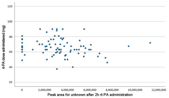 In the group of patients in whom we observed the new peaks just after rt-PA administration, the presence of these compounds was detected for a maximum of 24 h after treatment, and none were detected at time 4 (72 h after rt-PA). As can be seen from the time evolution profiles showed in Figure 2, the new compounds appeared shortly after rt-PA administration. In some cases, the maximum level was reached at the first sampling point taken after the treatment (2 h after), but in others, the maximum appeared after 6 h. Thereafter, there was always a decrease in the amounts detected, and they were never found after >24 h of treatment. No significant correlation was observed between the amount of the new compounds and the dose of rt-PA administered (median dose of rt-PA administered = 63.0 mg, interquartile range = [58.0,71.5]) (Figure 3, r = −0.178, p = 0.103).