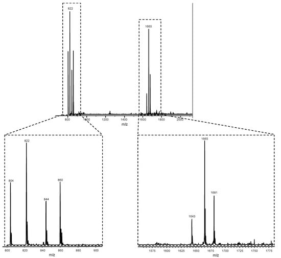 Unfortunately, it has not been possible to associate the found peaks to any specific molecule. Despite this, some information can be extracted from the results obtained. First, the new molecules found are highly hydrophilic. Second, the molecular mass determined with the ESI-MS results (821 Da) suggests that if these compounds are free glycans, they must be high-mannose type, probably residues containing five hexoses, which always show limited interaction with an RP chromatographic column and are eluted at low percentages of acetonitrile [18,41]. In another study, Pabst et al. [42] analyzed fibrin(ogen) N-glycans from various species, including humans, and found that all fibrins contained diantennary N-glycans. Moreover, on analyzing different isomers of non-derivatized glycans using single ion monitoring MS, they detected α-Gal containing glycans with a total of five hexose residues at a mass/charge ratio of 822. Another study analyzing mixtures of maltose standards also found that Man5 residues appeared at m/z values between 800–850 [40].