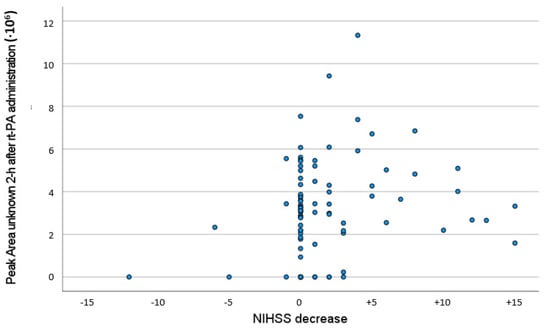 A significant correlation was found between the concentration of new compounds and the variation between NIHSS at 24 h and baseline (Figure 5, r = 0.216, p = 0.041). With regards to the association between the presence of new compounds in plasma and the neurological evolution of patients, 49 (70%) rt-PA-treated patients had early neurological improvement, whereas 21 (30%) did not (p = 0.026).