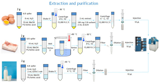Most methods require long and complex purification procedures to minimize matrix effects [24]. To properly compensate for any matrix effects, different approaches may be used, including the use of matrix-matched calibrants such as a standard addition to the blank matrix at the beginning of the sample preparation process or at the end of it, before instrumental injection. Alternatively, “isotopic dilution” (i.e., the addition of isotopically labelled internal standards) can be used for the same purpose.