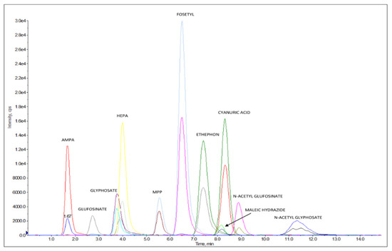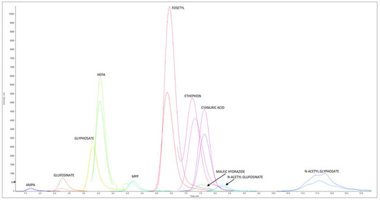 Figure 3 reports an LC–MS/HRMS chromatogram of a chicken egg sample spiked at 0.020 mg/kg for AMPA, cyanuric acid, ethephon, fosetyl Al, glyphosate, HEPA, maleic hydrazide, and N-Acetyl- glyphosate, at 0.004 mg/kg for glufosinate ammonium, MPP, and NAG, at 0.006 mg/kg AMPA-13C,15N, cyanuric acid 3C3, ethephon D4, fosetyl Al D15, glyphosate 2-13C,15N, HEPA D4, and N-Acetyl-glyphosate 13C2,15N, and at 0.0012 mg/kg for glufosinate ammonium D3, MPP D3, and NAG D3.