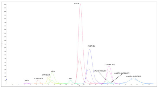 Figure 4 reports an LC–MS/HRMS chromatogram of a cow milk sample spiked at 0.040 mg/kg for AMPA, cyanuric acid, ethephon, fosetyl Al, glyphosate, HEPA, maleic hydrazide, and N-Acetyl- glyphosate, at 0.008 mg/kg for glufosinate ammonium, MPP, and NAG, at 0.006 mg/kg AMPA-13C,15N, cyanuric acid 3C3, ethephon D4, fosetyl Al D15, glyphosate 2-13C,15N, HEPA D4, and N-Acetyl-glyphosate 13C2,15N, and at 0.0012 mg/kg for glufosinate ammonium D3, MPP D3, and NAG D3.