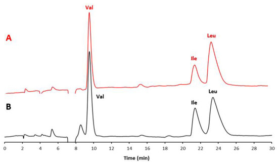 In spite of the advantageous features of the developed mLC-LC system, some issues should nevertheless be highlighted. First of all, the presence of EtOH in the mobile phase of the first dimension caused some interference with the retention times of the Val enantiomers in the second dimension. As a result, it readily emerged that it was impossible to adequately analyze Val enantiomers in this way. This problem did not disturb the enantioselective 2D heart-cutting analysis of the more-retained Ile and Leu. This drawback requires the development of different elution conditions for the 1D analysis, avoiding the use of EtOH. A fully aqueous mobile phase was therefore employed (Figure 2) and, in order to reduce the extremely high retention time, the temperature was increased to 45 °C. As expected, the absence of EtOH in the 1D mobile phase almost completely eliminated the interference occurring in the corresponding retention of the 2D Val enantiomers. This finding led to the hypothesis that the increase in temperature (45 °C) applied for enantioselective 1D analysis was also beneficial with respect to the noise effect derived from HFBA, probably due to the high volatility of this additive, which evaporated at the inlet of the second column. Finally, the analysis of the commercial food supplement (Figure 4) confirmed the exclusive presence of L-enantiomers in accordance with the producer’s declaration. This result was readily evident from both off-line and in-line analyses.