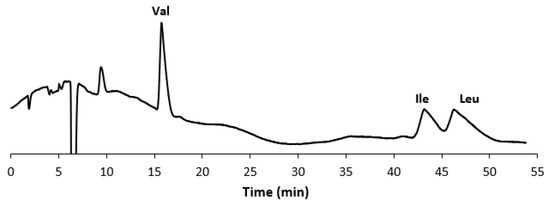 Based on the satisfactory results recently obtained in our laboratory [33], a water/EtOH—95/5 (v/v; 7mM of HFBA) mobile phase was initially tested. With a 7 mM HFBA concentration, the baseline separation of the three BCAAs was achieved, and the AAs were eluted in direct relation to their lipophilicity [37,38]. The elution order in the EtOH-based system was exactly the same as obtained with water/ACN mobile phases [37,38] (Val < Ile < Leu), even though EtOH produced lower elution efficiencies than ACN as a result of its slower mass transfer kinetics.