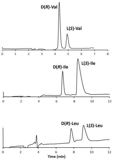 In the present work, the effect of low percentages (0–5%, v/v) of EtOH was evaluated, mostly to reduce the retention time of Ile and Leu, in an effort to keep the chromatographic performance unchanged. The obtained results were consistent with the literature [47]: increasing concentrations of organic modifier led to decreases in the retention, selectivity, and resolution factors. Most importantly, with 5% (v/v) EtOH, L- and D-Val were unresolved, while a general deterioration of the chromatographic performances was observed for the other two compounds (data not shown). This behavior can be explained by considering that the CLEC mechanism implies the superimposition of complexation events and hydrophobic interactions with the C18 layer [35,52,55]. Excessive reduction in the hydrophobic interactions led to an overall deterioration of the chromatographic performances. A D < L enantiomer elution order (EEO) was defined in all of the experimental conditions, by injecting pure enantiomeric standards. At the end of this optimization step, the best conditions identified for the analysis of the real sample were as follows: fully aqueous solution with 0.5 mM (S)-OBS + 0.25 mM Cu(II) nitrate, pH 4.0; 1.0 mL/min flow rate; wavelength of detection fixed at 254 nm; column temperature fixed at 25 °C.