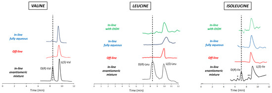 Chromatograms obtained for all three BCAAs in various types of analyses. From the bottom to the top: chromatogram of the artificial enantiomeric mixture analyzed in-line with the implemented LC-LC system (under fully aqueous condition in the achiral separation, black line); chromatogram of the fraction collected during the achiral separation (first dimension) and then reinjected into the chiral column (second dimension) after drying under vacuum and re-solubilized in the chiral selector/Cu(II)-containing eluent (off-line mode; red line); chromatogram of the fraction switched from the first (achiral) to the second (chiral) column, using the fully aqueous mobile phase in the first dimension (blue line); chromatogram of the fraction switched from the first (achiral) to the second (chiral) column, using the water/EtOH-containing mobile phase in the first dimension (green line). Chromatograms with red, blue, and green lines refer to the analysis of real samples (that is, the extract from the food supplement). Experimental conditions: column, Prevail RP18 (Grace, Sedriano, Italy) (250 mm × 4.6 mm i.d., 5 μm, 110 Å pore size); mobile phase, fully aqueous solution with 0.5 mM (S)-OBS and 0.25 mM Cu(NO3)2; column temperature, 25 °C; flow rate, 1.0 mL/min for Ile and Leu, 0.5 mL/min for Val; UV @ 254 nm.