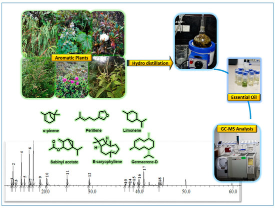 By this means, a great deal of effort has been invested in studying the chemical constituents of essential oils. Conventionally, infrared spectroscopy (IR) in combination with nuclear magnetic resonance (NMR) for assigning the stereochemistry and ultraviolet spectroscopy (UV) were considered as a convenient technique for the identification of those components [16]. However, these days, GC-MS has been extensively used to study the chemical constituents of aromatic plant species from a myriad of plant families [17,18]. GC-MS is one of the most effective techniques to unveil the underlying chemical blueprint of an essential oil [19]. Specifically, using the integrated technique of gas chromatography and mass spectrometry, the qualitative composition of the essential oil is analyzed by comparing the mass spectra with the library and further confirmed by their retention indices and fragmentation patterns.