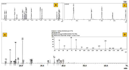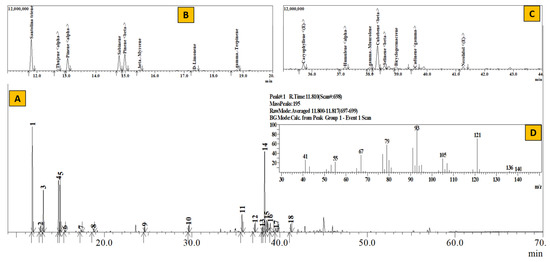 TIC of essential oil from Artemisia dubia (A), Inset: Extracted chromatogram from RT 11–20 min (B) and 35–44 min (C) and mass spectrum of Peak #1 (santolina-triene) (D).
