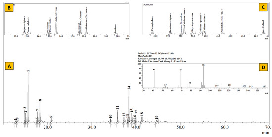 TIC of essential oil from Boenninghausenia albiflora (A), Inset: Extracted chromatogram from RT 11–22 min (B) and 35–45 min (C) and mass spectrum of Peak #5 (β-myrcene) (D).