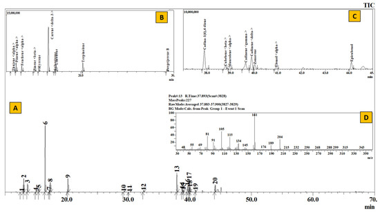 TIC of essential oil from leaves of Juniperus recurva (A), Inset: Extracted chromatogram from RT 11–30 min (B) and 37–45 min (C) and mass spectrum of Peak #13 (cadina-1(6),4-diene (D).