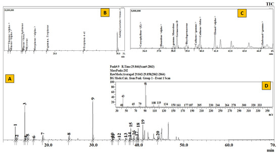 TIC of essential oil from Rhododendron setosum (A), Inset: Extracted chromatogram from RT 11–31 min (B) and 35–45 min (C) and mass spectrum of Peak #9 (trans-sabinyl acetate) (D).