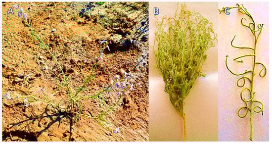 Overview of Matthiola longipetala DC. (A), flowering plant (B), and fruiting branches with legumes (C).