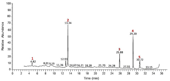 Chromatogram of basic chemical components interpreted from the MeOH extract of M. longipetala aboveground parts by GC-MS. The major compounds peaks are numbered in red color from 1–5.