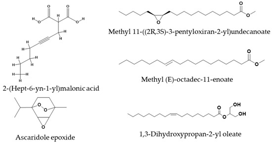 The M. longipetala extract had numerous main components (>2%), such as ascaridole epoxide, methyl (E)-octadec-11-enoate (12.21%), methyl 11-((2R,3S)-3-pentyloxiran-2-yl)undecanoate (7.51%), 1,3-Dihydroxypropan-2-yl oleate, 2-(hept-6-yn-1-yl)malonic acid (4.73%), 2-(acetylamino)-2-deoxyhexopyranose, 1-S-[(1E)-N-hydroxy-3-butenimidoyl]-1-thiohexopyranose (4.09%), (2Z,3E)-2-ethylidene-6-methylhepta-3,5-dienal (4.08%), 2-(((9Z,12Z)-Octadeca-9,12-dienoyl)oxy)propane-1,3-diyl diacetate, ethyl 2-hydroxycyclohexane-1-carboxylate (3.68%), (R,Z)-12-hydroxyoctadec-9-enoic acid, (3R,4S,5R)-3,4-dihydroxy-5-(1,2,3,4-tetrahydroxybutyl)dihydrofuran-2(3H)-one (2.64%), 4-amino-1,5-pentandioic acid (2.25%), and 2-bromotetradecanoic acid (2.17%) (Figure 3).