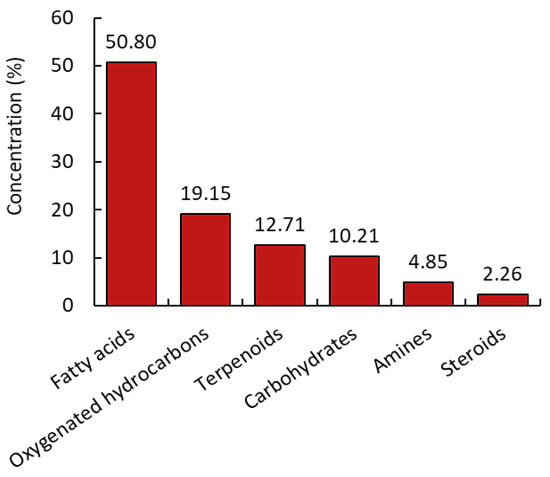 These compounds account for 63.50% of all recognized chemical substances (Table 1). The chemical composition of M. longipetala extract in the present study revealed variations to those reported for the Libyan ecospecies [27]. In addition, desulphosinigrin was identified as glucosides in the present study; however, Hammami et al. [20] and Hammami et al. [19] identified different glucosides and phenolics in the Tunisian ecospecies. Six categories may be established from the M. longipetala methanol extract’s chemical components (Figure 4) which are identified as oxygenated hydrocarbons (19.15%), carbohydrates (10.21%), amines (4.85%), terpenoids (12.71%), fatty acids and their derivatives (50.8%), and steroids (2.26%). Therefore, the fatty acids class and their derivatives “lipids” are the entire major constitutes with 50.8%, and only ascaridole epoxide as a monocyclic monoterpene compound was identified with 12.71% of the total percentage of the methanol extract chemical constitutes.