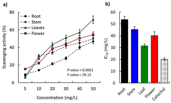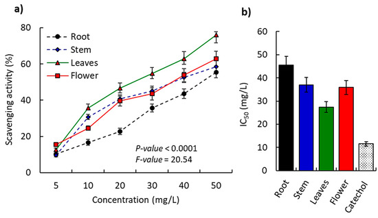 At the lower dose (5 mg/L), flower extract showed the highest activity (15.65%); moreover, at the highest concentration of the extract (10 mg/L), the most potent scavenging activity percent (30.34%) was documented for leaf extract. Subsequently, and based on the calculations of the IC50 values, the results verified that leaf extract has the highest antioxidant scavenging activity (IC50 = 31.47 mg/L) compared to the other plant parts (Figure 5b). Furthermore, the flower extract revealed IC50 of 40.19 mg/L in the second order of the antioxidant potency followed by stem extract (IC50 = 45.4 mg/L), and finally root extract (IC50 = 53.76 mg/L).
