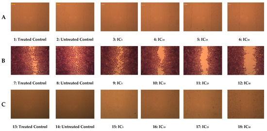 Cell migration is an important procedure that is integrated into many biological processes, such as tissue formation, development of the embryo, inflammation, immune defense, and cancer development [26]. After being treated with M. longipetala extract in the current study, HepG2 cell lines demonstrated wound healing activity in the cell migration test, where cells moved and covered the scratch’s center (Figure 7).