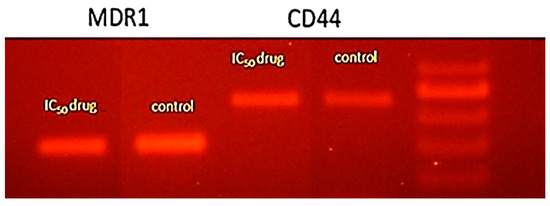 In order to evaluate the mRNA expression of CD44 and MDR1, the PCR method was employed. The cells were treated with M. longipetala extract for 24 h and collected for the extraction of the cellular RNA. The total RNA was transferred to cDNA using (Qiagen, Germantown, MD, USA) 1 µL of cDNA in a total volume of 20 μL containing 10 μL Master Mix (Dream Taq Green PCR Master mix 2X, Thermo Fisher, Waltham, MA, USA), forward primer (0.5 μM), and reverse primer (0.5 μM) then the reaction volume was completed up to 20 μL using nuclease-free water. Conditions for the thermal cycle were set for denaturation at 95 °C for one minute, annealing at 72 °C for one minute, and a final extension of 10 min at 72 °C. The mRNA expression primer sequences were MDR1 at 58 °C: 5′-CCC ATC ATT GCA ATA GCA GG-3′ (forward), 5′-TGT TCA AAC TTC TGC TCC TGA-3′ (reverse), CD44 at 55 °C: 5′-TTT GCA TTG CAG TCA ACA GTC-3′ (forward), and 5′-TTA CAC CCC AAT CTT CAT GTC CAC-3′ (reverse).
