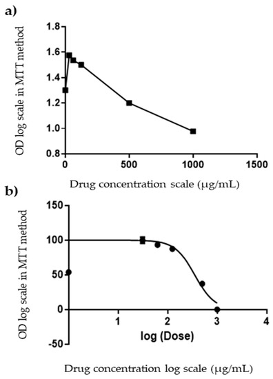 Dose–response curves of M. longipetala extract cell growth inhibition as a percent of control against HepG2 cell lines. (a) Transform of the extracted M. longipetala, (b) Normalization of transform, OD is the absorbance value.