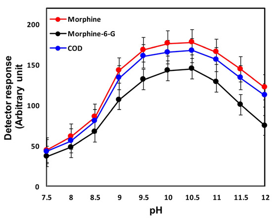 Because it influences both the charges of MOR, MOR-6-G, and COD as well as the surface properties of the fused-silica capillary, pH is one of the most critical parameters for enhancing the efficiency of the present CE method. Furthermore, the reaction of the tested analytes with ferricyanide was always conducted in an alkaline medium. The possibility of disodium tetraboratedecahydrate as a running alkaline electrolyte for in-capillary derivatization and separation of MOR, MOR-6-G, and COD from endogenous serum matrix components was investigated in this study. The effect of pH on the rise-rates of fluorescence intensity of MOR, MOR-6-G, and COD was studied over the range 7.5–12. The fluorescence signals of MOR, MOR-6-G, and COD increased as the pH increased from 7.5 to 10.5 above which they gradually decreased (Figure 1). The unfavorable effect of increasing pH on MOR, MOR-6-G, and COD fluorescence signals could be attributed to the short duration stability of the pseudo-derivatives as well as an increase in baseline noise.