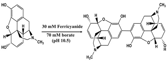Increased detection capabilities and selectivity of capillary zone electrophoresis (CZE) can be successfully acquired with the aid of chemical derivatization [19,20,21]. However, pre-capillary derivatization can be time consuming, unreliable and difficult to be implemented with small sample volumes. On the other hand, it would be advantageous to carry out derivatization in a close physical proximity to the capillary condition to minimize sample handling. A short capillary column with a very small inner diameter can combine the sample and reagent in one step and thus reduce sample and reagent solutions resulting in faster analyses and minimizing unused amounts of reagents [22]. On-line capillary derivatization is therefore easier, faster, and may be carried out without modifying the configuration of the conventional available CE devices. Because of its remarkable advantages over the conventional pre-capillary derivatization techniques, the in-capillary derivatization was conducted in the present study. In this approach, the capillary is not only used as a separation chamber, but also as a microreactor in which derivatization is achieved during electrophoresis of sample through the running electrolyte containing the derivatization reagent. Although, native fluorescence intensity of MOR and MOR-6-G can be used for their analysis, it is necessary to derivatized these compounds into highly fluorescent derivatives prior to CE analysis for sensitivity enhancement. Thus, an additional step that has the potential to significantly improve sensitivity and selectivity is the derivatization of analytes with certain reagents in conjunction with fluorescence detector. It has long been recognized that the use of ferricyanide in which MOR can be chemically transformed into highly fluorescent pseudo derivatives (Scheme 1), is an effective modification approach for a variety of separation techniques including CE and HPLC [23,24,25], and that it enhances the overall selectivity and sensitivity. Highly florescence pseudo-derivatives of MOR and MOR-6-G could be achieved by in-capillary derivatization using an oxidative-coupling reaction of the analytes with potassium ferricyanide in alkaline medium [23]. Because of the extended conjugation of the pseudo-derivatives, their fluorescence characteristics are greater than those of native molecules.