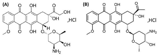 Chemical structure of doxorubicin (DOX) (A) and daunorubicin (DAY) in the form of hydrochloric acid salts (B).