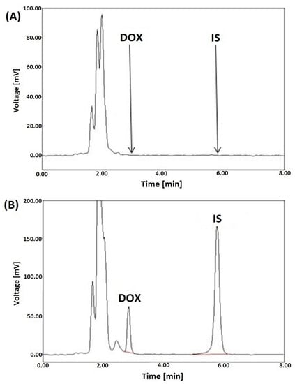 Validation of the developed SPE-LC-FL method was based on internal standard (IS), and for this proposal, epirubicin, idarubicin, and DAU (Figure 1B), each in the form of hydrochloric acid, were tested as potential IS. These substances belong to the group of anthracycline drugs and have similar physicochemical properties to DOX; however, those compounds are never used concomitantly during cancer pharmacotherapy to avoid the occurrence of serious side effects. Ultimately, DAU was selected as IS because of the higher analyte signal and a retention time of this compound that was different from DOX retention time, which allowed us to shorten the overall analysis time to 8 min. The experimental data obtained in this study are consistent with previously published data, where DAU was used as the IS for DOX determination in animal tissue samples [14,20,21,22,23,27,29].