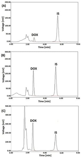 The acquired chromatograms, shown in Figure 2A,B, showed that the signal peaks from endogenous compounds in the tissues were not interferences between the peaks from DOX and the IS. This confirms that the developed SPE-LC-FL protocol is selective.