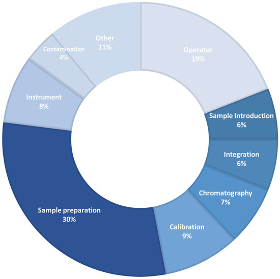 Particular attention is paid to novel extraction techniques, which significantly reduced the number of operations to be carried out during sample preparation. The aim was to develop extraction devices and technologies easily for operators to reduce time and minimize errors during operations [37]. As reported in Figure 1, sample preparation remain the principal source of error generated during chromatographic analysis. In the “other” section were reported all other points not specifically reported and labelled in Figure 1 (e.g. purity of chemical reagents, their "age" and expiration date, etc.).