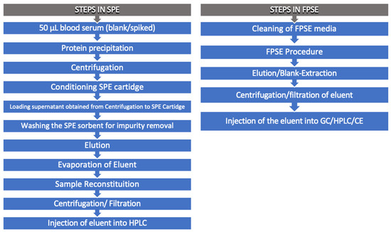Samanidou et al. used three FPSE media membranes, in particular, sol-gel poly (dimethyldiphenylsiloxane) (sol-gel PDMDPS), sol-gel poly (tetrahydrofuran) (sol-gel PTHF,) and sol-gel poly (ethylene glycol) (sol-gel PEG) to determinate benzodiazepines from human blood serum. The authors demonstrated the simplicity of this extraction in terms of the number of operations in comparison with other innovative techniques, such as SPE [57]. Figure 2 compares the steps involved in SPE and FPSE.