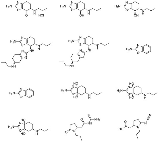 Several studies have been published describing different methods for identifying and evaluating the organic impurities and related compounds of the pramipexole active pharmaceutical ingredient (API) and its corresponding formulated drug products. These methods are mainly based on the use of reversed-phase high-pressure liquid chromatography (HPLC) coupled with UV detection [10,11,12,13,14,15]. The synthesis of some of the pramipexole related impurities was also described in several of these published studies. Generally, pramipexole impurities are produced during the synthesis of pramipexole API, either from the starting materials, from the intermediates or as a by-product of the API manufacturing process. Impurities can also result from product degradation during drug product preparation/manufacturing due to exposure to unfavorable processing conditions or during drug product storage. The originator reported seventeen impurities in the quality inspection standards for pramipexole dihydrochloride tablets; twelve impurities are known as non-pharmacopeial pramipexole-related compounds (Figure 2), and the remaining five impurities (Table 1) are identified in the United State Pharmacopeia (USP) and European Pharmacopeia (Ph. Eur.) [2].