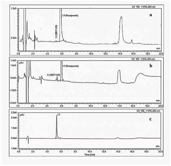 HPLC-UV chromatograms using organic impurity test method in USP monograph of pramipexole (a) Initial stability sample, 1.5 mg·mL−1 (b) stability sample stored for 12 months at 30 °C/65%RH, 1.5 mg·mL−1 (c) 0.5 mg/mL solution of the synthesized degradation impurity.