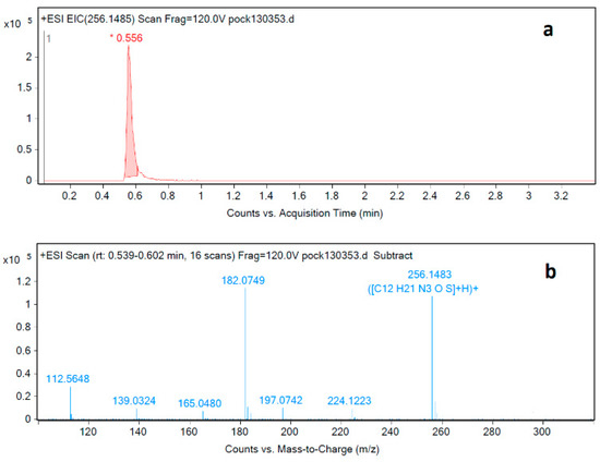 The pramipexole degradation impurity at RRT 0.88 was isolated from sample solution using HPLC. This was followed by applying a new LC-MS method specifically developed to identify this impurity. The USP test procedure calls for using an ion-pair reagent that is unsuitable for LC-MS analysis due to the high buffer content in the mobile phase. Therefore, a new analysis method compatible with LC-MS was developed, and the impurity at RRT 0.88 was analyzed and identified using the newly developed LC-MS method (Figure 5a). The mass spectrum of the degradation impurity was obtained using LC-MS-QTOF (Figure 5b). A molecular ion peak [M+H]+ at m/z 256.1483 is consistent with the molecular formula C12H22N3OS for [M+H]+.