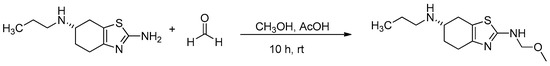 By analyzing the LC-MS mass spectrum of the target impurity, a new methoxymethyl group was recognized as part of the overall impurity structure. A full literature review revealed that a synthetic method for producing similar compounds has been reported by Ji et al. [18]. The reported synthetic approach shows that the N-methoxymethyl moiety can be synthesized from its corresponding amine by the condensation of the amine with formalin and methanol, which are considered as solvents and reactants (the source of methoxymethyl group) at the same time (Figure S1). The reaction conditions reported by Ji et al. for the synthesis of N-methoxymethyl moieties were applied in the case of pramipexole hydrochloride. In this case, pramipexole is considered the source of the primary amine group needed for such reaction.