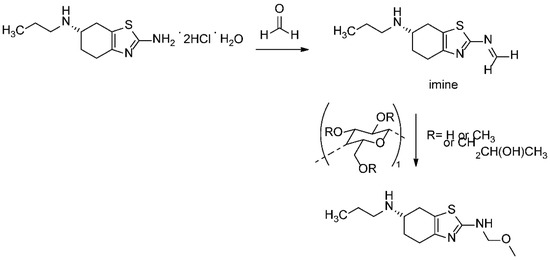 It is known that the poor stability of the prior art compositions of pramipexole dihydrochloride can be attributed to the presence of celluloses or any other excipients that may contain trace levels of formalin. Formalin can catalyze the conversion of pramipexole dihydrochloride to its corresponding imine (Figure 7) [19,20]. The specific cellulose used as an excipient in the tablet formulation analyzed in this research is hydroxypropyl methyl cellulose (HPMC), a well-known source for the methoxy group adding to the formed imine intermediate. Taking all excipient and formulation related information into consideration, the proposed degradation pathway is described in Figure 8. It should be noted that the tablet formula includes other excipients, as described in Table S1. Apart from HPMC, none of these excipients contribute to the identified reaction.