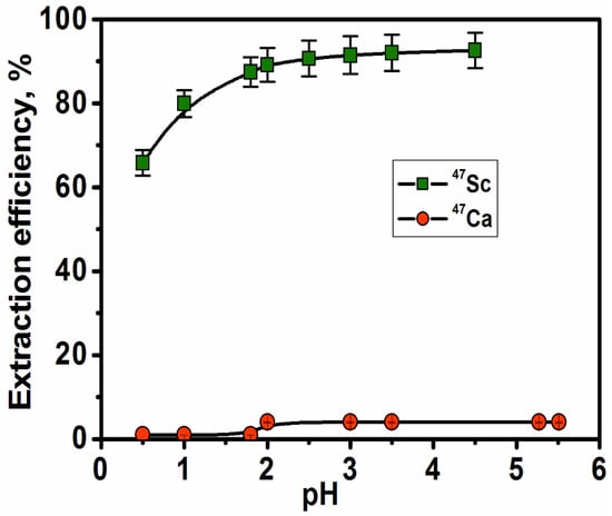 Effect of initial pH on the extraction efficiency (%) of 47Sc and 47Ca at a 1:1 phase ratio, with 0.025 M Cyanex 272, an extraction time of 30 min, and at 25 ± 1 °C.