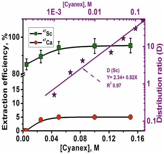 Theranostic orientation tools, which integrate both diagnostic and therapeutic applications, have been developed recently that utilize specific radionuclides with the ability to perform both simultaneous functions for the same patient [,,]. In this technique, the selected radionuclides could be a matched pair of the same element or a comparable pair of two different elements []. Moreover, various factors affect the selection of these radionuclides, such as nuclear emission properties, decay characteristics, half-life time, availability, and the cost of their production []. It has been noted that radionuclides with beta emission energy in the range of 400–800 keV and a half-life of several days are promising for applied nuclear medicine []. One of the promising and efficient theranostic agents is scandium, which has three radionuclides (43Sc (t1/2 = 3.89 h), 44Sc(t1/2 = 3.97 h), and 47Sc (t1/2 = 3.35 day)). Despite the fact that Sc and Lu have identical properties, 47Sc is preferred over 177Lu(t1/2, 6.65 day), as 47Sc can be easily separated and purified from its irradiated target. The clearest variation between 47Sc and 177Lu is the remarkably shorter half-life of 47Sc, which enables the combination of 47Sc with low-molecular-weight and peptide-based targeting ligands with a moderately fast blood clearance []. The production of 47Sc can proceed via various routes []. It may be produced via fast neutrons on enriched Ti as a 47Ti(n,p)47Sc reaction, or via thermal neutrons on enriched Ca via the 46Ca(n,γ)47Ca→47Sc reaction for a 47Ca-47Sc (t1/2 = 4.5 d) generator system []. These methods provide important characteristics to establish a promising generator system for 47Sc, such as 47Ca/47Sc. This allows for multiple extractions of 47Sc after a certain ingrowth period. One of the more important keys to 47Sc production is to obtain a high separation yield that achieves high specific activity with excellent radiochemical, radionuclidic, and chemical purities []. Numerous methodologies based on filtration, precipitation, electro-amalgamation, adsorption, and extraction chromatography are applied to radioanalytical chemistry. Ion exchange/adsorption [,] and liquid–liquid extraction [] have been wildly utilized for efficient purification and separation tasks. Several techniques have been developed for the separation and purification of no-carrier-added (NCA) 47Sc from an irradiated Ca(II) target. Among these methods, the liquid–liquid extraction process has been gaining considerable interest recently due to its fast extraction rate and high loading features [,,]. Various efforts have been carried out for the separation of 47Sc. Pietrelli et al. [] reported the separation of carrier-free 47Sc by liquid–liquid extraction using tri-n butyl phosphate (TBP) as an extractant. Another extractant, di-2-ethyl hexyl phosphoric acid (HDEHP), was utilized by Aly et al. [] and Lahiri et al. []. Rizk et al. utilized a quaternary ammonium salt (Aliquat 336) for the extraction of scandium from concentrated sodium hydroxide using 10% (v/v) octanol as a modifier []. The prospect of (bis(2,4,4-trimethyl pentyl) phosphinic acid (Cyanex 272) as an extractant (Figure 1), has been well confirmed. The advantages of Cyanex 272—such as its complete miscibility with common organic diluents, poor aqueous solubility, and resistance to hydrolysis—may be purposively used in commercial processes for the separation of ions [,,]. Herein, we report a systematic procedure for radiochemical separation of NCA 47Sc from an irradiated natCa target via a liquid–liquid extraction method. The conditions were optimized for achieving maximal separation efficiency of the process and high purity.