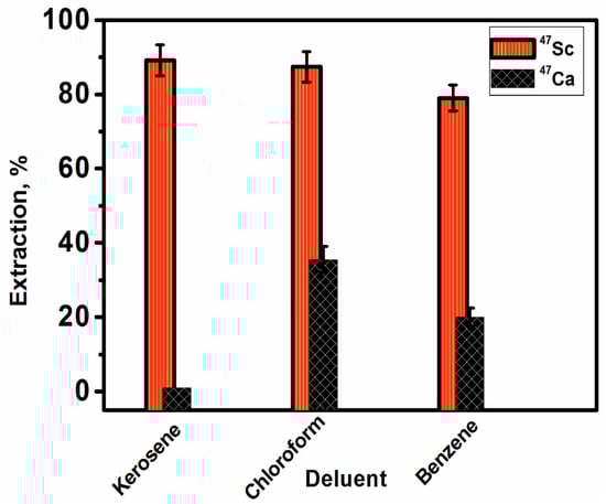 Several factors influence the extraction of metal ions using organic extractants; for example, the impact on mass transfer, solubility, diluents, and sometimes even participation of the diluent in the extraction process itself can play a role due to their aggregation in the organic phase []. In this respect, kerosene, chloroform, and benzene were examined as diluents for Cyanex 272 to elucidate the extraction efficiency of 47Sc and 47Ca at a 1:1 phase ratio, pH 1.8 (0.015 M HCl), extraction time of 30 min, and 25 ± 1 °C. Based on the obtained data presented in Figure 4, the extraction efficiency of 47Sc is extremely similar for kerosene and chloroform (E = 89.5%); however, there was a decrease in the extraction of 47Sc when benzene was used as a diluent (E = 79%). It was verified by Das et al. that the increase in the extraction rate of Sc(III) using organophosphorus reagents with kerosene was greater than that when using benzene as a diluent []. On the other hand, a low E (%) of 47Ca was observed using Cyanex 272 dissolved in three diluents, and the lowest was for kerosene, so it is preferable to choose kerosene as a diluent to obtain a high selectivity and separation factor for 47Sc.