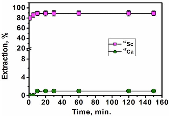 Effect of contact time on the extraction of 47Sc and 47Ca at a 1:1 phase ratio, with 0.025 M Cyanex 272, at pH 1.8 and 25 ± 1 °C.
