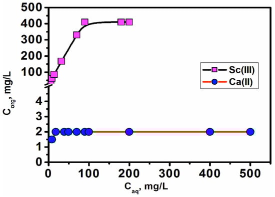 The extraction of carrier-free 47Sc and 47Ca using 0.025 M Cyanex 272–kerosene was detected at different initial metal concentrations (10–500 mg/L) of Sc(III) and Ca(II), spiked with their radioisotopes (47Sc and 47Ca) at an O/A ratio of 1:1, with an extraction time of 10 min, at pH 1.8 and 25 ± 1 °C. Figure 6 depicts the isotherm of Sc(III) and Ca(II) extraction. The amount of scandium loaded into the organic phase increased with an increase in the initial concentration, with an insignificant amount of loaded calcium. The functional dependency line becomes parallel to the abscissa when the initial concentrations of Sc and Ca reach 500 and 20 mg/L, respectively, indicating the saturation of the extractant. The capacity of 0.025 M Cyanex 272–kerosene for Sc(III) and Ca(II) was 410 and 2 mg/L, respectively. Table 2 shows the capacity of different extractants compared to Cyanex 272 for the extraction of Sc, indicating the high selectivity and extraction efficiency of Cyanex 272–kerosene for Sc.