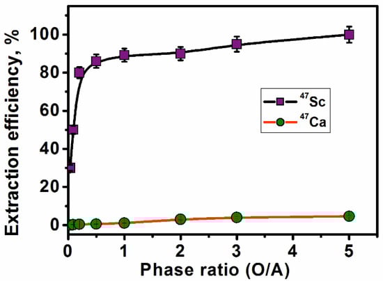 Extraction experiments for 47Sc and 47Ca were conducted at different phase ratios (O/A) with a constant equilibrium conditions. As shown in Figure 7, the efficiency of scandium extraction increased with the increase in the phase ratio (O/A). About 80% of the initial activity of 47Sc was extracted at a phase ratio (O/A) of 1:5. Increasing the phase ratio (O/A) from 1:1 to 5:1, the extraction efficiency of scandium increased from 89.2% to 99.9%. The extraction efficiency of 47Ca in the studied O/A range remained below 5%. Moreover, the E (%) of 47Ca was 1% at O/A 1:1. Therefore, a phase ratio (O/A) of 1:1 is suitable for the separation of 47Sc/47Ca.