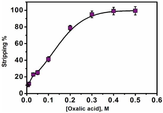 The stripping examination is one of the most important steps for achieving the separation of different radioisotopes in ion pairs. In this regard, the loaded 47Sc isotope in the organic phase Cyanex 272 was subjected to a stripping process using different concentrations of oxalic acid ranging from 0.005 to 0.5 M, based on the high affinity between scandium(III) and oxalate ions []. According to the results presented in Figure 8, the stripping efficiency (%) of the 47Sc isotope from loaded Cyanex 272 increased from 10 to 99.2% when increasing the oxalic acid concentration from 0.005 to 0.4 M. These results are consistent with the findings of previous works [,] that utilized oxalic acid for the stripping of Sc(III) (≈100%). It should be noted that 1% of loaded 47Ca was not detected in the solution of the eluent.