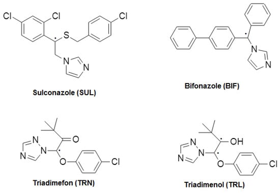 Azoles are used extensively in pharmacology leads and for agricultural crop protection [,]. Azole fungicides such as sulconazole and bifonazole have well-documented activities against superficial skin infections, whereas triadimefon and triadimenol have most widely been employed to control plant diseases. All of them have one or two asymmetric carbon atoms in their structure, but whereas the first two are imidazole derivatives, the others include a triazole ring (see Figure 1). The antifungals selected share the same mechanism of action inhibiting the ergosterol synthesis via cytochrome P450 [].