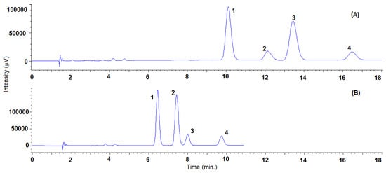 Representative SFC-UV (220 nm) chromatogram obtained with Lux® Cellulose-2 column of triadimenol standard using isopropanol (A) or methanol (B) as a modifier under the same conditions in isocratic elution (8%), temperature (35 °C), pressure (150 bar) and flow rate (2 mL/min). Peaks 1: TRL-Threo-1, 2: TRL-Eritro-1; 3: TRL-Threo-2; 4: TRL-Erytro-2. System suitability parameters are summarized in Table S1.