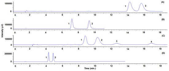 Concerning the effect of the organic modifier, a decrease in the polarity of the organic modifier generally causes an increase in the retention, consequently in the order of methanol < ethanol < isopropanol solvent. Nevertheless, in the case of TRL, when using the Lux® Cellulose-2 column, isopropanol provided the lower retentions and satisfactory resolutions between the four stereoisomers. This behavior has also been noticed for other compounds using polysaccharide-based columns [,], and could be due to the higher hydrogen-bond-accepting ability of isopropanol. As a general rule, methanol provided the highest enantioresolutions with all of the CSP checked, except for SUL. In this case, and for any of the columns studied, no sign of enantioseparation was observed using methanol, even at low percentages. The highest enantioresolution for SUL was obtained using isopropanol and the Lux® Cellulose-2 column. In addition, in the cases of TRN, using the Lux® Amylose-2 and Reflect™ I-cellulose C columns, and TRL, using the Lux® Amylose-2 column, isopropanol provided the highest enantioresolutions. It is important to note that, when employing the Lux® Cellulose-2 column, the four stereoisomers changed the elution order when methanol was replaced by isopropanol (see Figure 2 and Table S1 to check system suitability parameters). Using methanol, the two first eluted enantiomers were those of the threo form, which was predominant in the standard and thus provided the biggest peak.